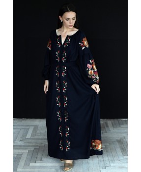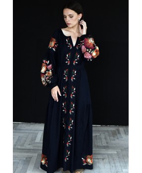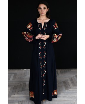 Довга лляна сукня із клинами вишита гладдю.